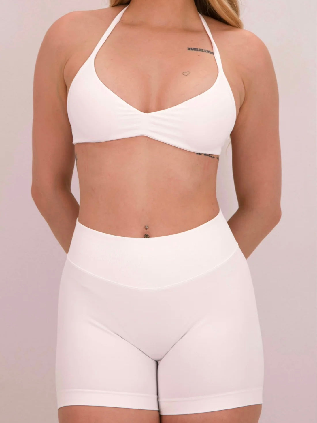 Diseñado para quienes buscan soporte y estilo en cada entrenamiento. Su detalle scrunch en la parte frontal potencia el busto de forma natural, mientras que el corte halterneck resalta hombros y espalda, dejando la zona superior del torso libre para moverte con confianza.