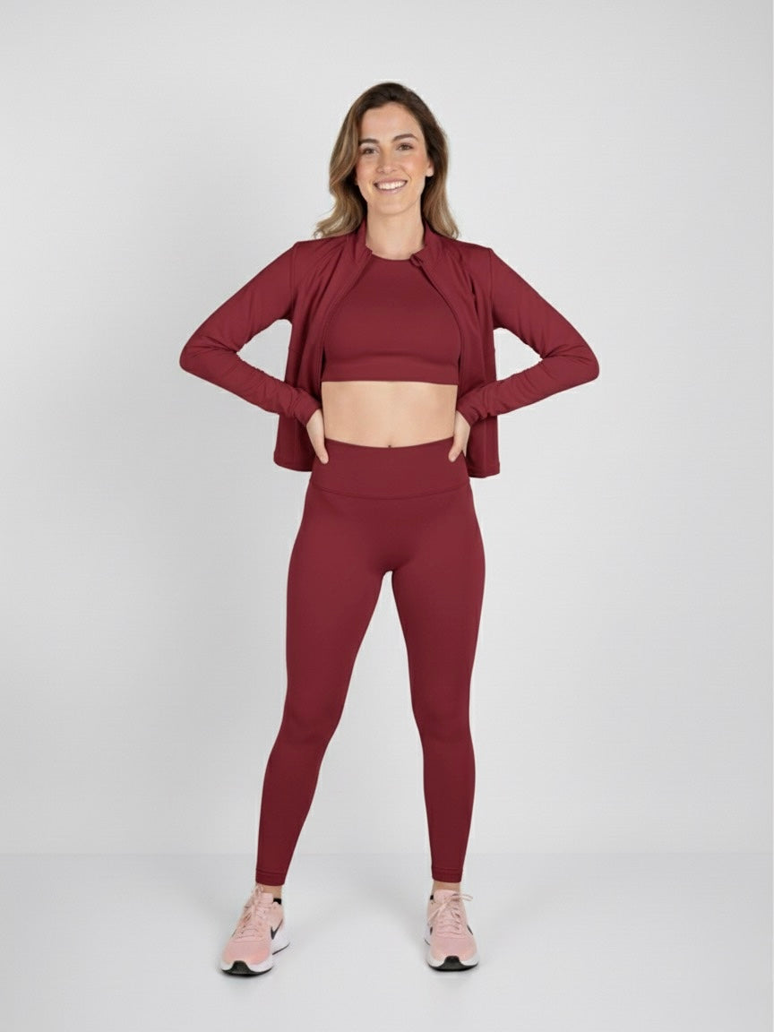 Un set versátil y sofisticado que fusiona tecnología de alto rendimiento con estética high-end. Compuesto por un top corto de manga, leggings de tiro alto y una casaca estructurada, está confeccionado en nuestro tejido Soft Touch de compresión premium, que envuelve el cuerpo con suavidad impecable mientras define la silueta. Diseñado para entrenar, moverte y elevar tu estilo dentro y fuera del gym con un aire de exclusividad.
